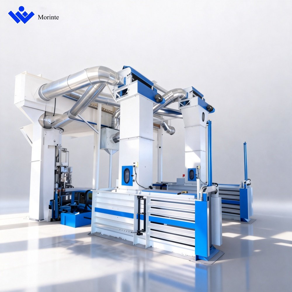 This type with fiber collecting machine, this system fixed with fan which used to absorb material to here, wind will be removed through dust cage and make materail dropped directly to the baling box.